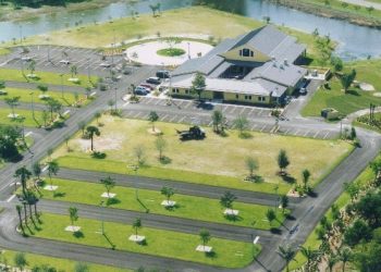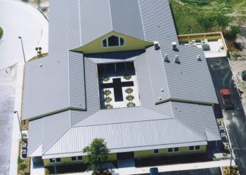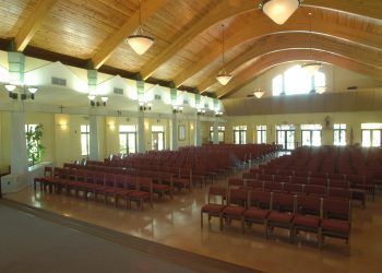 A single-story building constructed of concrete block with glulam beams and a wood deck under a metal roofing system. The building consists of meeting rooms, a commercial kitchen area, a central courtyard, and a main hall.